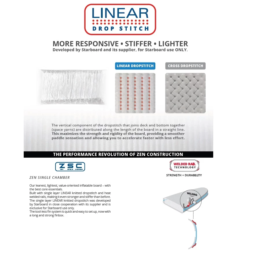 Nos planches à pagaie gonflables les plus fines, les plus légÚres et axées sur la valeur – avec les meilleurs éléments essentiels. Construit avec une seule couche de point de chute linéaire tricoté, une technologie de rail soudé et des rails galvanisés 2000D, rend la construction Zen encore plus solide et plus rigide qu’auparavant. Le Dropstitch tricoté linéaire monocouche a été développé par Starboard en étroite collaboration avec son fournisseur et est UNIQUEMENT destiné à l’usage de Starboard. Le systÚme d’aileron sans outil est rapide et facile à installer, maintenant avec une boîte d’aileron longue et solide. La nouvelle option à double chambre offre une plus grande résistance et rigidité et est la gagnante de l’offre de prix.